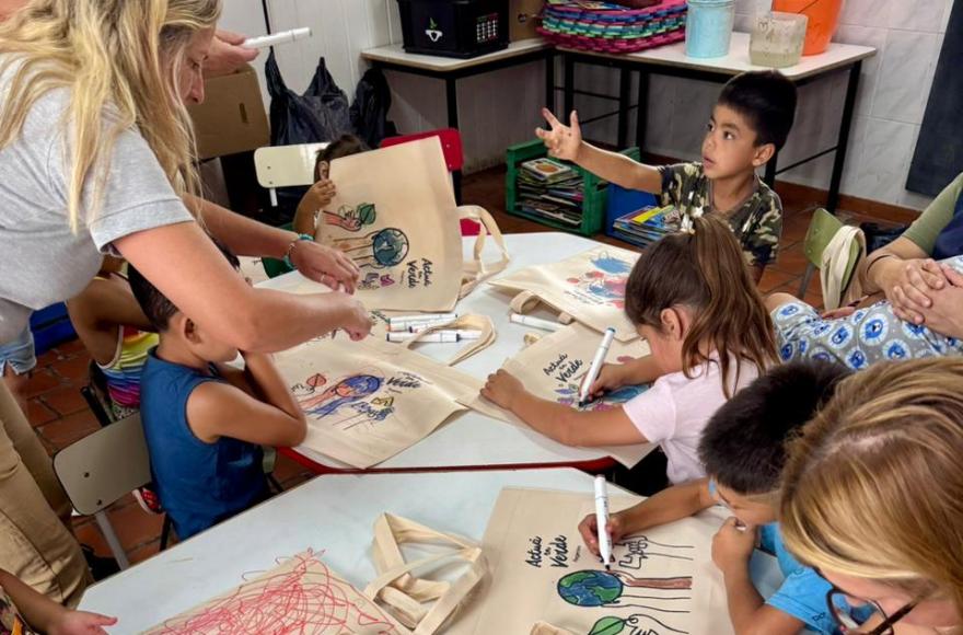 Durante la jornada participaron los chicos del centro y también se sumaron chicos del programa Clickeados, quienes intervinieron de manera creativa las nuevas bolsas de Actuá en Verde, pintándolas con marcadores.