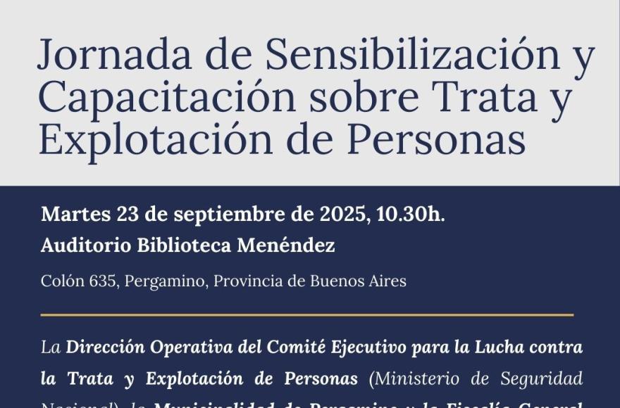 Se llevará a cabo el martes 23 a las 10.30 horas en el Auditorio de la Biblioteca Menéndez, organizada por la Dirección de Asistencia a la Mujer y la Familia, y será dictada por personal de la Dirección Operativa del Comité Ejecutivo para la Lucha contra la Trata y Explotación de Personas (Ministerio de Seguridad de la Nación) y del Ministerio Público Fiscal, y estará dirigida al público en general.