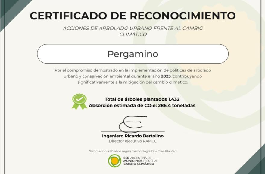 El reconocimiento fue realizado por la Red Argentina de Municipios frente al Cambio Climático y destaca la política pública y las acciones de arbolado urbano llevadas adelante en Pergamino para mitigar el cambio climático. La cifra de ejemplares plantados el año pasado en nuestro Partido implica (de acuerdo a lo informado por esa entidad) una absorción estimada de CO2e de 286,4 toneladas.